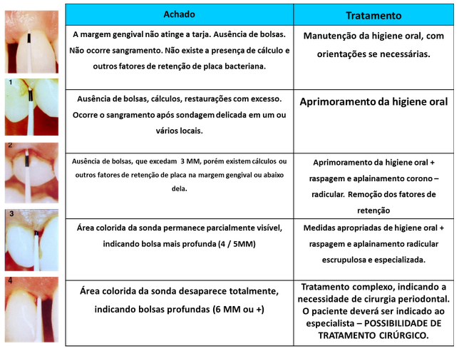 Conforme a penetração da sonda (com pressão constante de 20g) e a profundidade da tarja em relação à margem gengival estará indicado o tipo de tratamento recomendado àquele paciente. Os princípios do Índice das Necessidades de Tratamento Periodontal na Comunidade (CPITN) são assim descritos e utilizados: