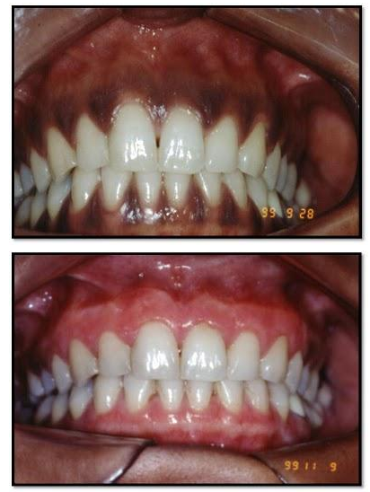 Gengivite Estabelecida Intensa (acima) e Caso Após Raspagem e Gengivectomia (abaixo)