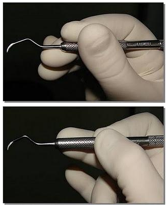 Os dedos mais utilizados para o apoio são o médio e o anular, com o intuito de facilitar a penetração da parte ativa do instrumento no interior da bolsa, e evitar o escape do instrumento, causando danos aos tecidos, sangramento sem necessidade e dor desnecessária no pós – operatório.